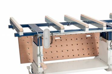 - 5 seiltich verschiebbare C-Profilauflageschienen mit Hartholzauflagen (in der Tiefe verschiebbar)