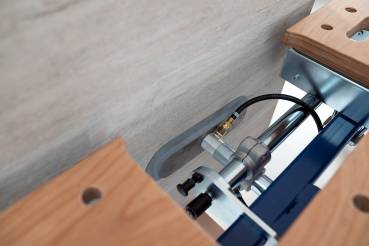 Bei der Werkstückbearbeitung und speziell bei der Kanten- und Oberflächenbearbeitung kommt die leistungsstarke Vakuum-Spannvorrichtung mitsamt ihren beiden ovalen Sauggreifern zum Einsatz. Per Fußschalter wird der Vakkum-Unterdruck aktiviert, der sich bei Annäherung der Werkstückoberfläche an das Tastventil der Sauggreifer auf das Werkstück überträgt und dieses anhand der Saugkraft sicher und effizient spannt.