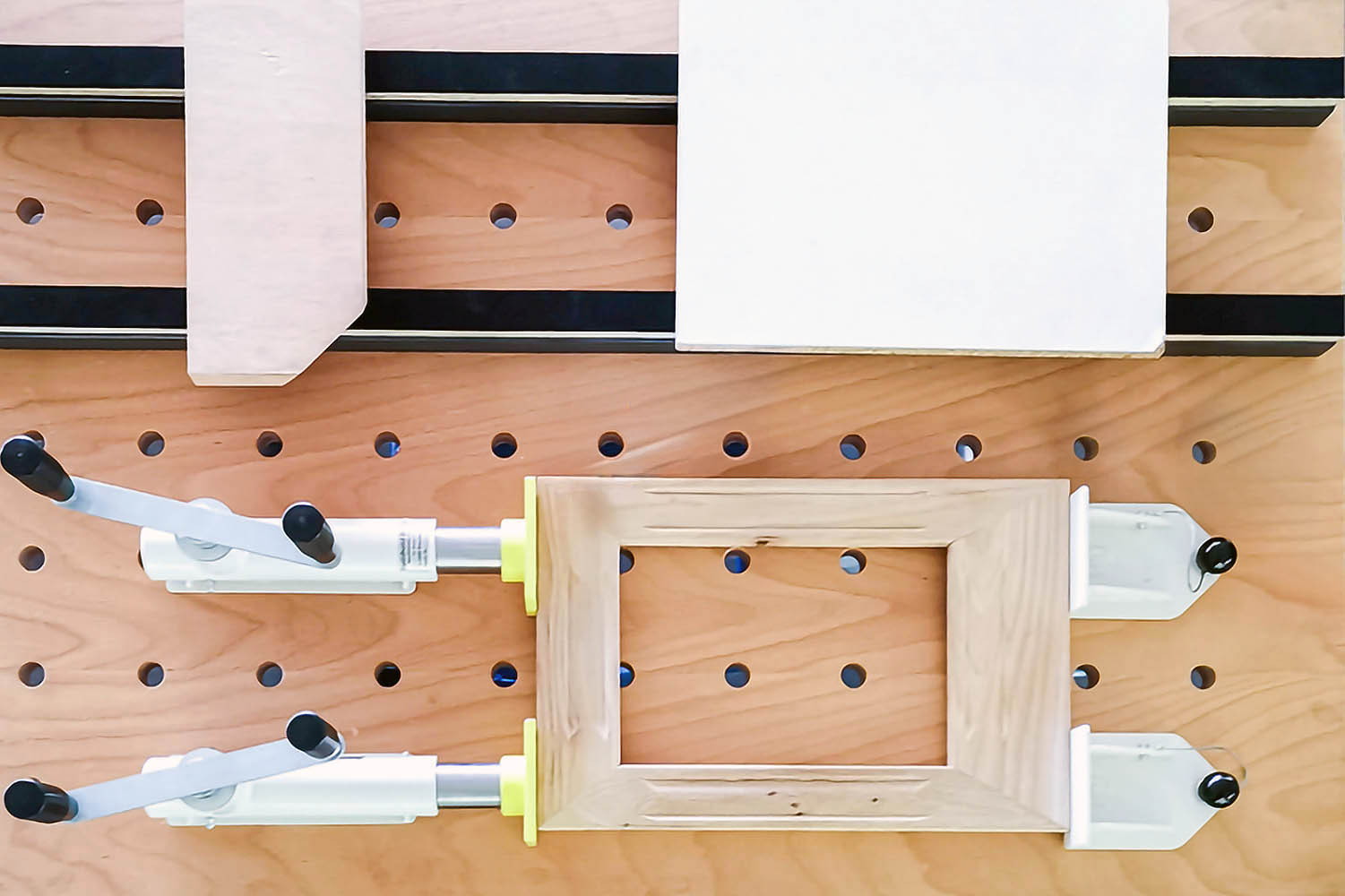 Zusatzliches Feature:Für die vier im Set enthaltenen Vertikal-Spannwingen sind noch zweit T-Nut-Adapter im Lieferumfang enthalten. Dadurch lassen sie sich nicht nur auf Lochrasterplatten, sondern auch an vorhandenen Maschinen mit Schiebeschlitten verwenden, etwa auf einer Formatsäge oder Tischfräsmaschine.